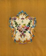 Dossier de fauteuil. Médaillon de style Louis XV à entrelacs or et feuilles d'acanthe sur fond blanc, contrefond jaune réséda.