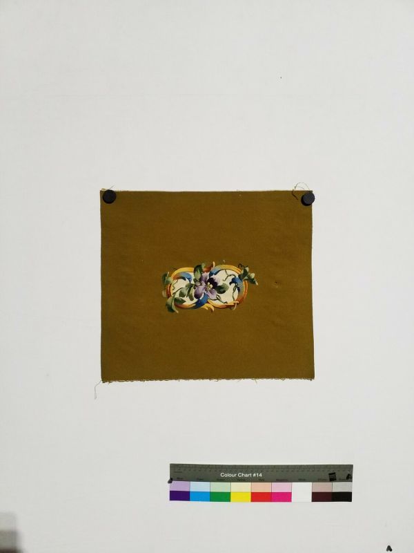Manchette de fauteuil, fond vert moutarde, motif d'arabesque en forme de 8 avec une pensée en son centre.