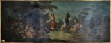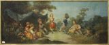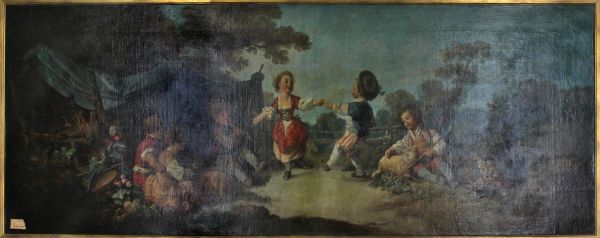 Huile sur toile représentant des enfants dansant dans un paysage champêtre. Dans un décor de verdure, deux villageois dansent devant un pont, un autre joue de la flute, à la droite des danseurs un villageois est assis près d'un mouton.