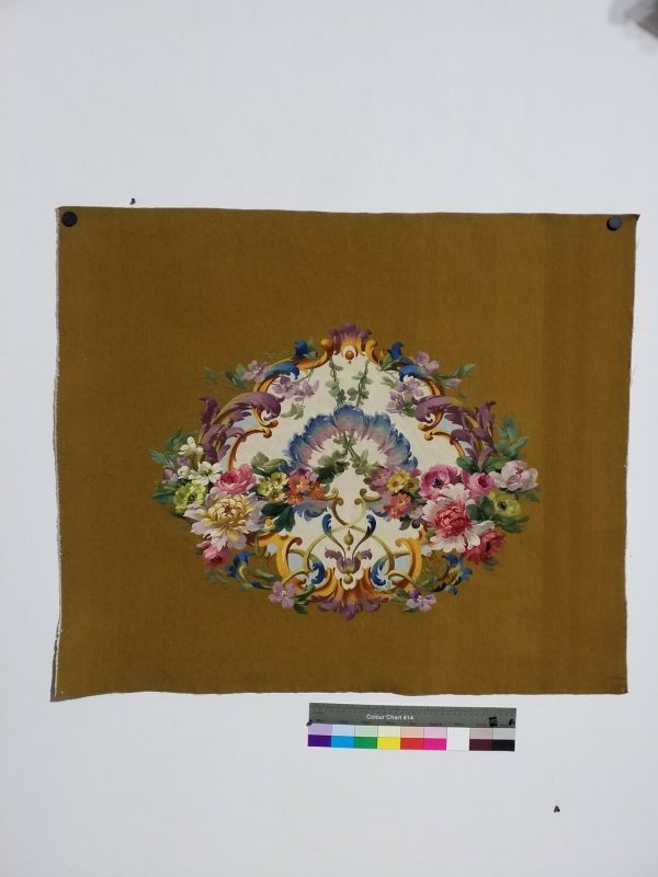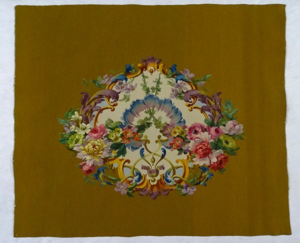 Fond d'assise de fauteuil fond vert moutarde. Cartouche à fond blanc et arabesques et guirlandes de fleurs remplis de fleurs (pivoines, roses, pensées…).