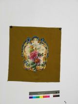 Dossier de chaise, fond moutarde. Cartouche à arabesque de forme violonée fond blanc à pivoines et hortensias.