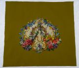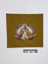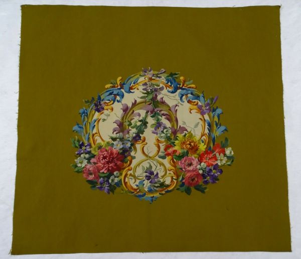 Assise de chaise, fond moutarde, motif d'arabesque en forme d'ovale agrémenté de guirlandes de fleurs (pivoines, pensées, …).