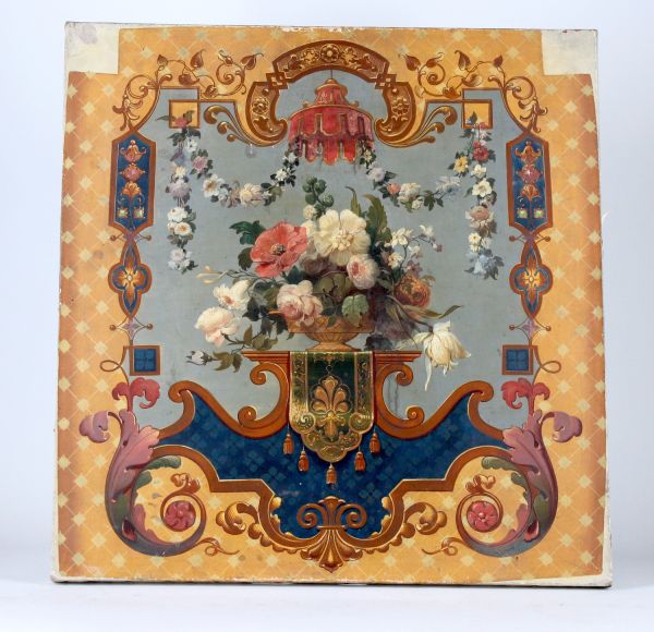 Sur un fond gris se détache un bouquet de fleurs dans un vase posé sur une console contenant une draperie. Dans la partie inférieure, cartouche à fond bleu. Dans la partie supérieure, une couronne à laquelle deux guirlandes de fleurs sont suspendues.