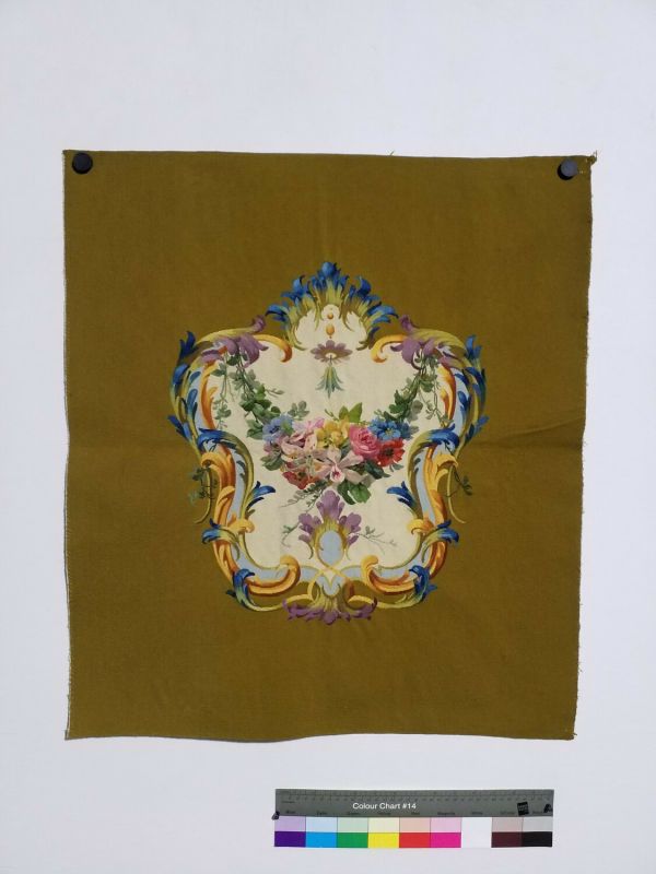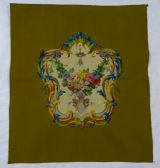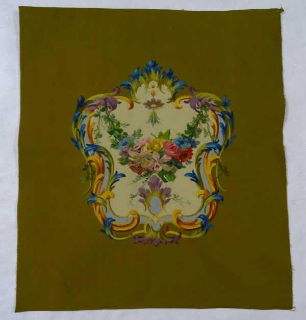 Dossier de fauteuil à motif de médaillon rocaille à fond écru avec une guirlande florale (roses, fleur de lys, …) suspendue, contrefond vert.
