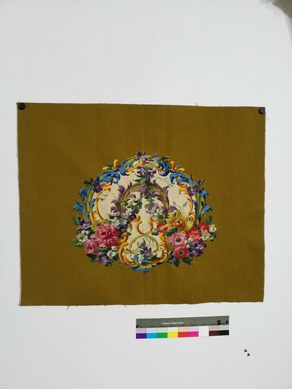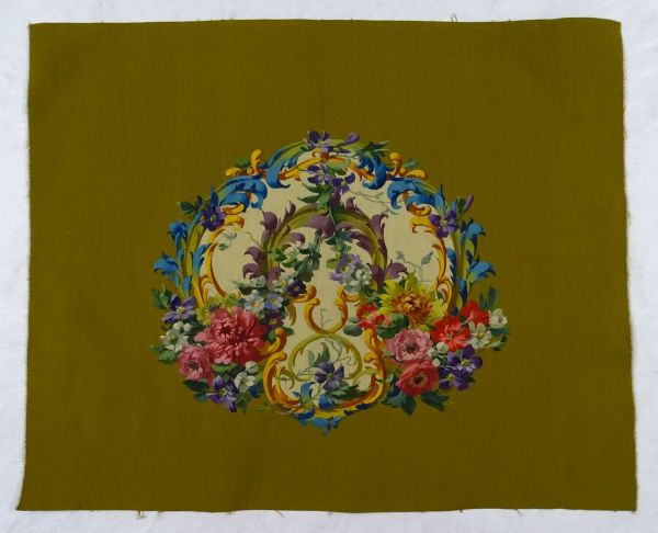 Assise de chaise, fond moutarde, motif d'arabesque en forme d'ovale agrémenté de guiralndes de fleurs (pivoines, pensées, …).