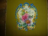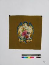 Dossier de chaise, fond moutarde. Cartouche à arabesque de forme violonée fond blanc à pivoines et hortensias.