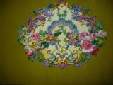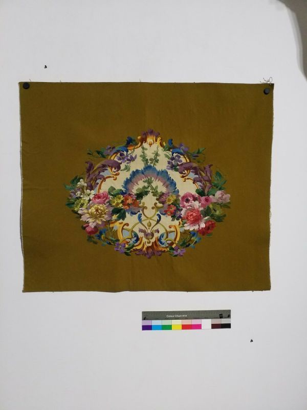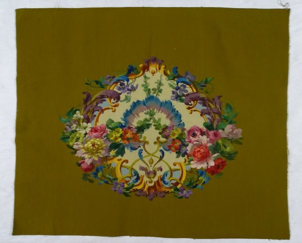 Assise de fauteuil fond moutarde. Cartouche à fond blanc et arabesques et guirlandes de fleurs remplis de fleurs (pivoines, roses, pensées…).