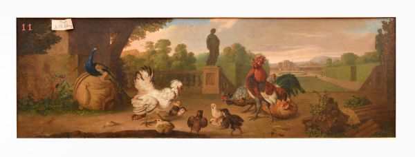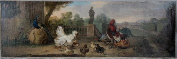 Dans un fond de paysage antique représentant des jardins, se trouvent au premier plan des animaux de basse-cour, des poules et un paon. De la végétation pousse sur les débris d'une colonne, le fût cannelée est séparé de son chapiteau corinthien. Des personnages se font voir au loin dans les jardins. Un escalier conduit à un château avec un bassin.