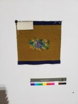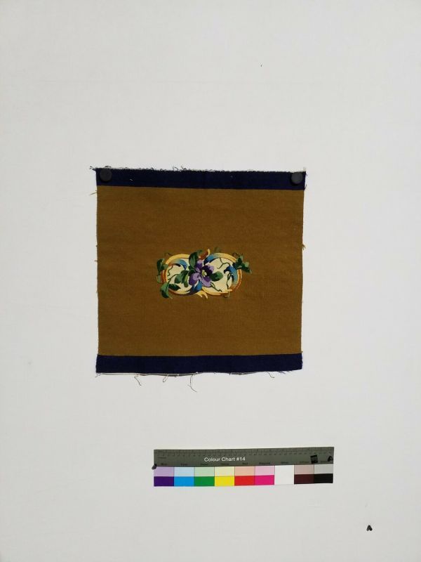 Manchette de fauteuil, fond moutarde, motif d'arabesque en forme de 8 avec une pensée en son centre. Bordure bleue présente des deux côtés.