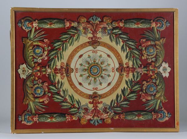 Décor de couronne de lauriers et palmettes sur fond beige contrefond rouge, guirlandes de fleurs et enroulements de feuilles d'acanthe. Cadre doré. Baguette dorée et châssis à traverse et à clefs.