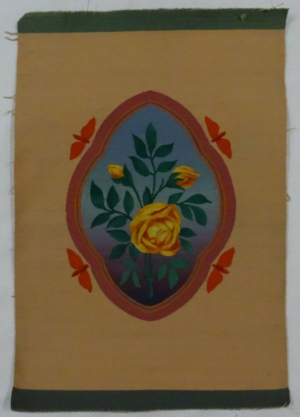 Médaillon chantourné à bordure multicolore et bouquet de roses-thé sur fond bleu-violet en dégradé ; quatre papillons oranges volent autour du médaillon sur fond chamois, bordure grise verdâtre.