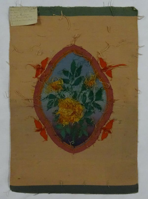 D'une série d'études d'élèves de la manufacture de Beauvais pour le meuble n° 24, "La Danse", tissé entre 1919 et 1923 d'après des cartons commandés en 1914 à Paul Séguin-Bertault. Le meuble complet, soit un canapé, deux fauteuils, quatre chaises et un écran, fut vendu non monté en 1927 à M. Mallet, industriel à Beauvais.