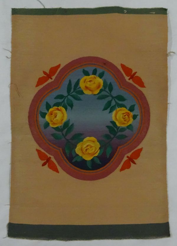 Médaillon chantourné à bordure multicolore et couronne de roses jaunes sur fond bleu-violet en dégradé; quatre papillons oranges volent autour du médaillon sur fond chamois, bordure grise et verte.