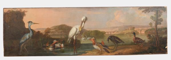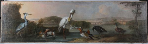 Modèle pour fond de canapé. Dans un paysage de fleuve surmonté de deux ponts sur un arrière plan montagneux, se trouvent au premier plan, un échassier blanc, trois canards de barbarie et un ordinaire, ainsi que deux cygnes en arrière plan.