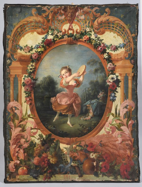 Dans un médaillon ovale une fillette debout joue du tambourin. Pourtour extérieur à fond bleu décoré de rinceaux, de fruits à la partie inférieure.