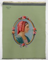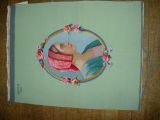 Décor : sur fond vert anis un médaillon central sur fond bleu clair, listel dorée et bleu (2 tons) avec 6 roses et ruban violet, et tête de femme avec un chaperon rose et une robe violette et veston vert.