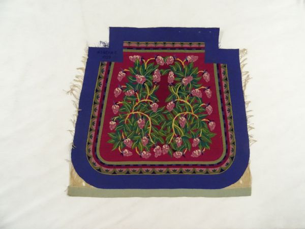 Décor de branches de mûrier aux baies sur fond lie de vin, encadrement de listels à festons, contrefond bleu, bordure vert d'eau.