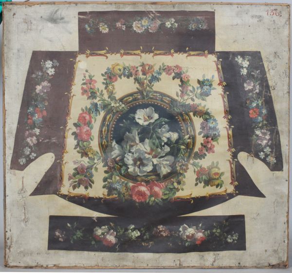 Un premier meuble fut tissé à Beauvais à partir de 1853 sous l’appellation de « Fonds brun et blanc » (Arch. M.N., B 183) ou « Style Louis XVI, fond brun et blanc » (Arch. M.N., B 214), d’après des cartons de Chabal-Dussurgey. Un grand nombre de ces cartons, d’ensemble ou de détail, sont conservés. Le peintre s’inspira fortement de modèles existants du XVIIIe siècle (voir GMMP 290 et GMMP 25274), déjà imités par Gustave Damis en 1846, dans le cadre d’un ensemble de lambrequins et rideaux destiné au salon de billard du palais des Tuileries (voir GMMP 13).
