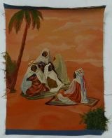 Scène arabe avec 6 femmes assises sur tapis dans désert rouge. Bordure bleue.