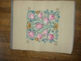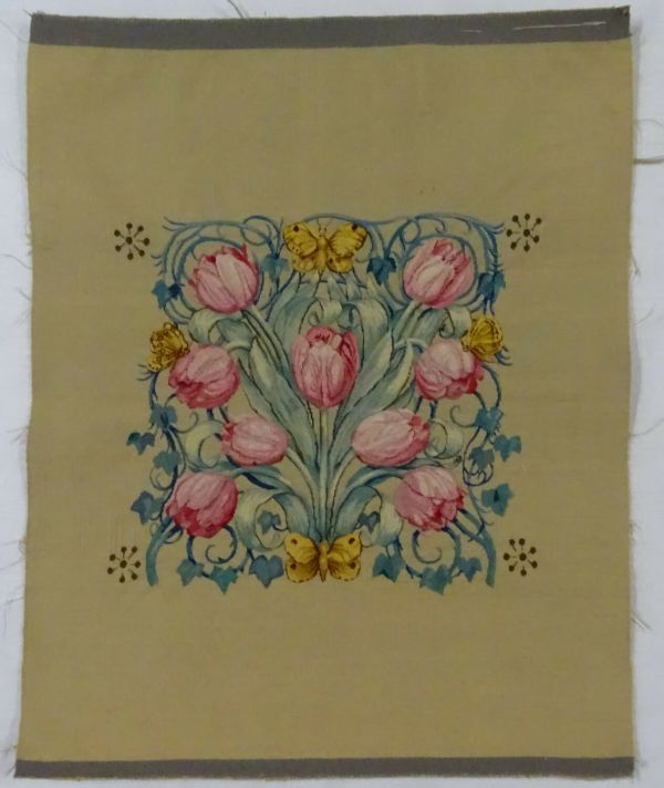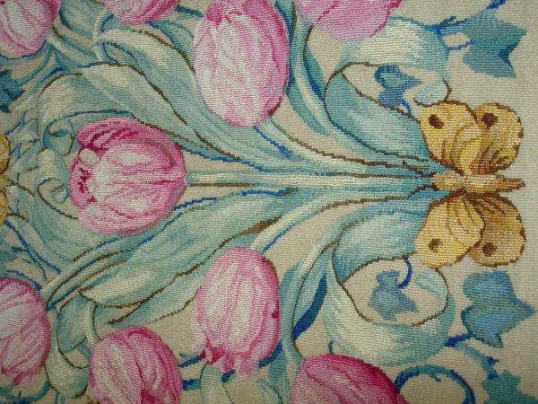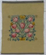 Arrangement symétrique de tulipes roses, entrelacs de feuillages en rinceaux bleu vert, 4 papillons sur les quatres côtés. Fond beige. Bordures grises.