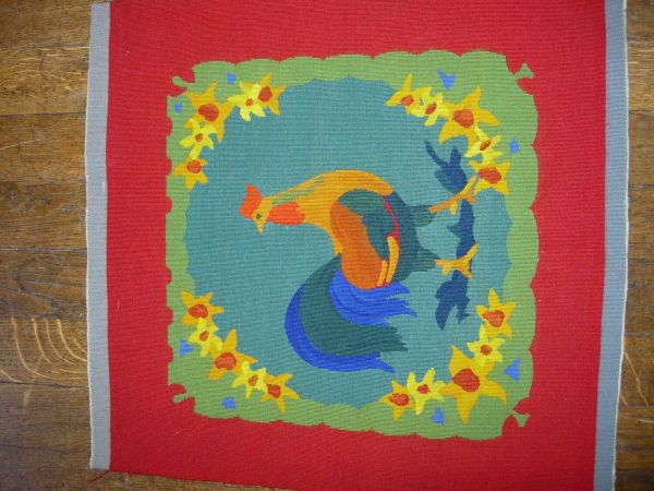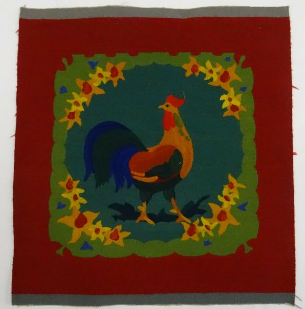 Décor : contrefond rouge avec une scène centrale sur fond vert (2 tons) avec des fleurs jaunes et oranges aux quatre coins du listel vert clair et un coq au centre.
