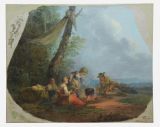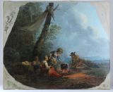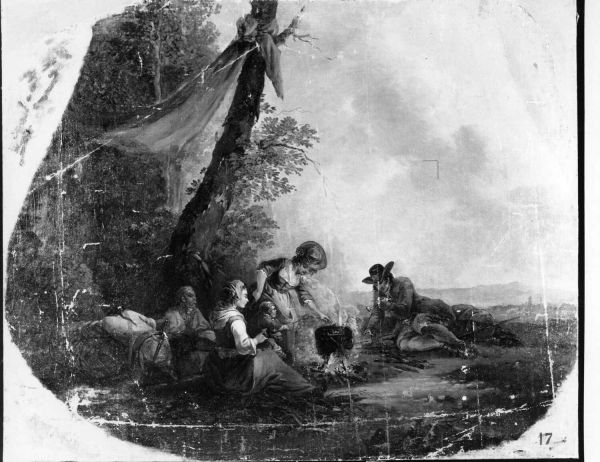 Modèle pour l'assise d'un fauteuil représentant un bivouac : six personnages dont un enfant sont réunis à l'orée d'une forêt, devant un feu sur lequel est placé une marmite. Dans l'angle inférieur droit figure le numéro du meuble, « 17 », destiné au tissage.