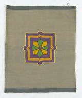 Motif de rosace géométrique jaune, verte, violette, le tout sur fond gris.