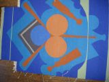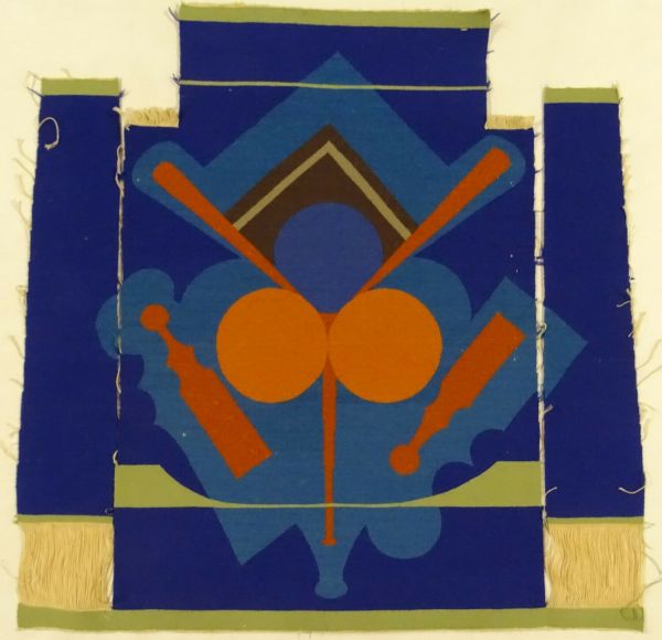 Forme trapèze, décor dans les tons orange, bleu et brun représentant les éléments du billard sur fond bleu outre-mer. 4 plates-bandes tissées avec la pièce. Bordures vertes.