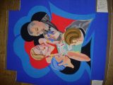 Deux couples jouant au bridge sur fond bleu outre-mer, bordures marron.