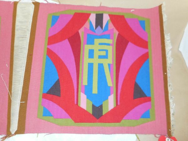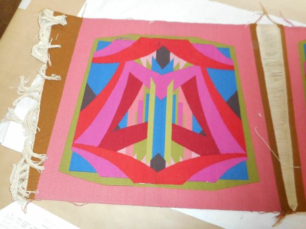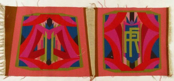 Dossier et assise tissées ensemble. Décor géométrique dans un cadre vert, contrefond rose, bordures marron.