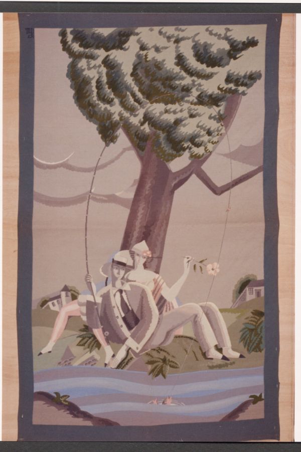 Un homme et une femme sont adossés à un arbre. Assis dans l'herbe, au bord de l'eau, l'homme tient une canne à pêche. Un poisson mord au bout de la ligne.