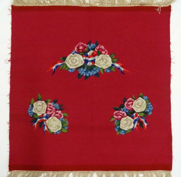Décor : sur fond cramoisi, 3 bouquets de fleurs bleues, roses, jaunes et rouges, noués par des rubans bleu, blanc, rouge.