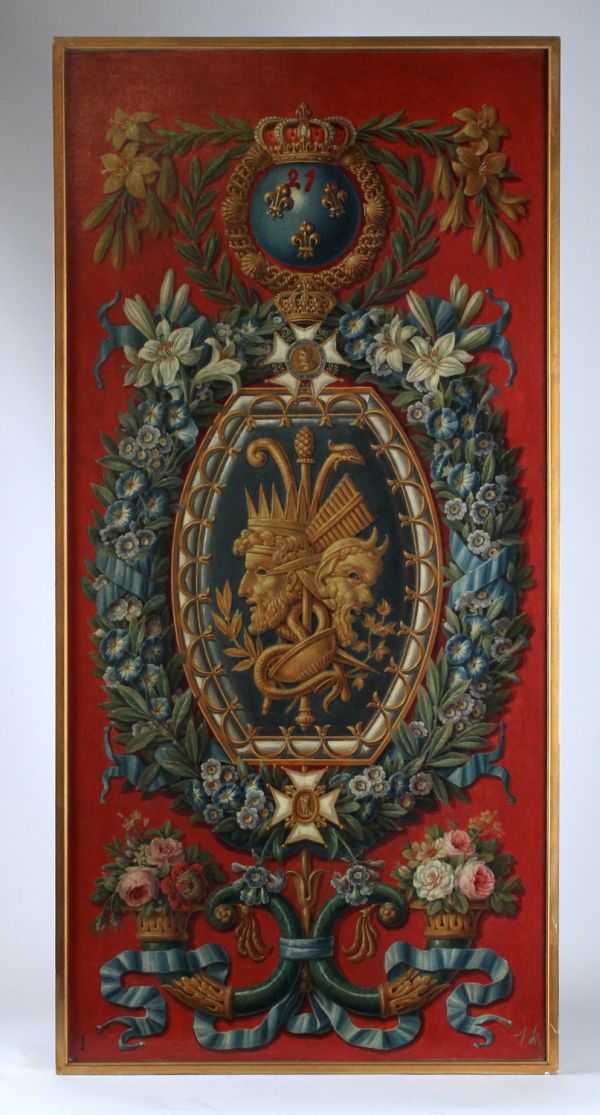 Dans un hexagone à fond gris, deux figures sont adossées, encadré de fleurs, de rubans bleus et de feuilles vertes. Fond général rouge. A la partie inférieure : cornes d'abondance attachées par des rubans bleus. A la partie supérieure : écu rond aux armes de France modernes timbré d'une couronne royale en entouré du collier de l'ordre de Saint-Michel.