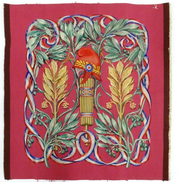 Sur fond cramoisi un ruban bleu, blanc, rouge encadre avec des branches d'olivier deux palmettes dorées et un faisceau de licteur au centre coiffé un bonnet phrygien rouge orné d'une couronne de lauriers. Bord latéraux marron.