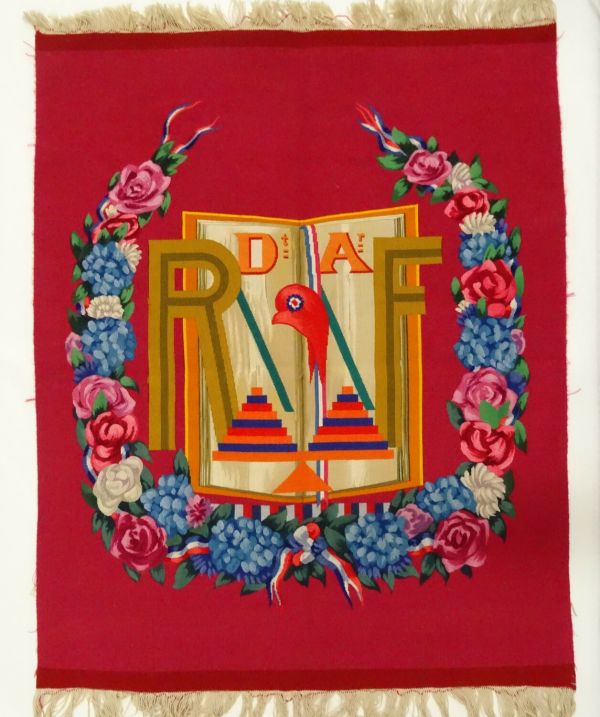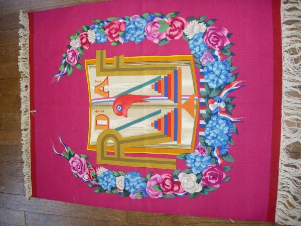 Décor : sur fond cramoisi, une cocarde bleu, blanc, rouge au centre derrière un monogramme "RF" doré (2 tons) central, entourés d'une guirlande de fleurs et d'un ruban tricolore (bleu, blanc, rouge) entremêlé.