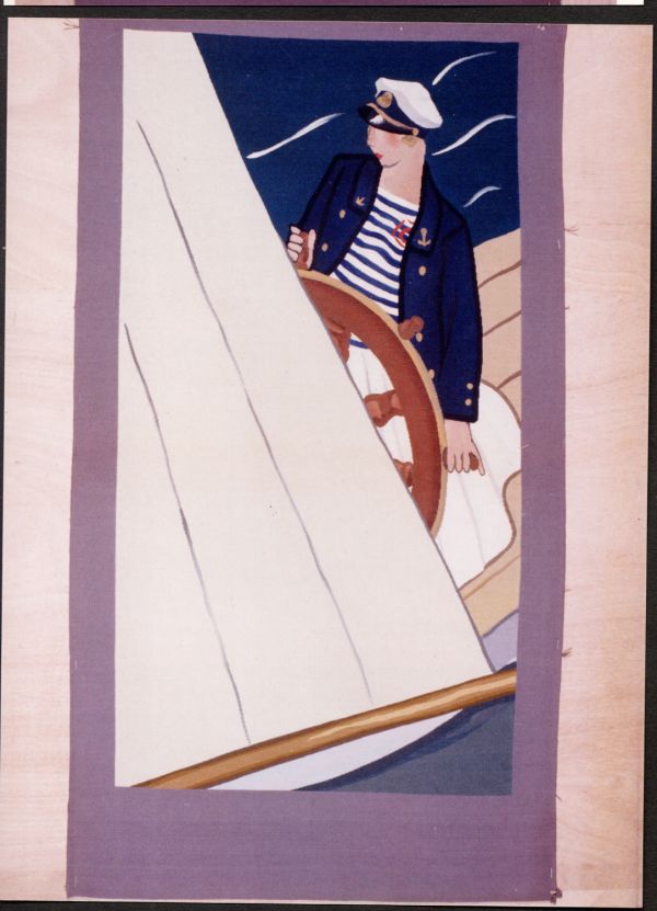 Un marin sur un bateau avec roue et grande voile, bordure mauve