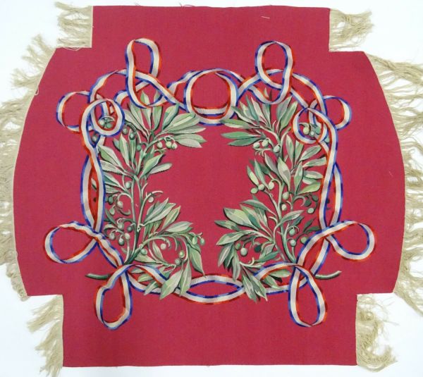 Sur fond cramoisi, un ruban bleu, blanc, rouge encadre des branches d'olivier vertes (2 tons).