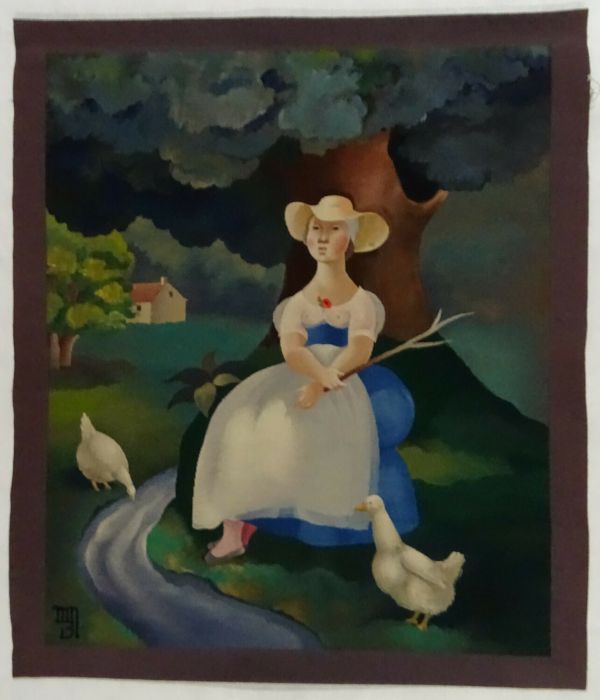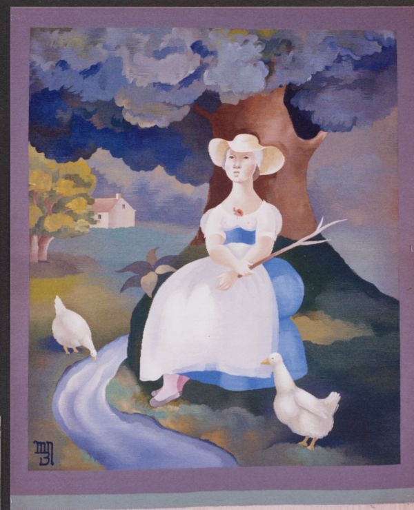 "Gardeuse d'oies" assise sous un arbre devant un ruisseau où s'abreuve une oie, une autre oie à ses pieds. Petite maison au deuxième plan. Bordure gris-violet.