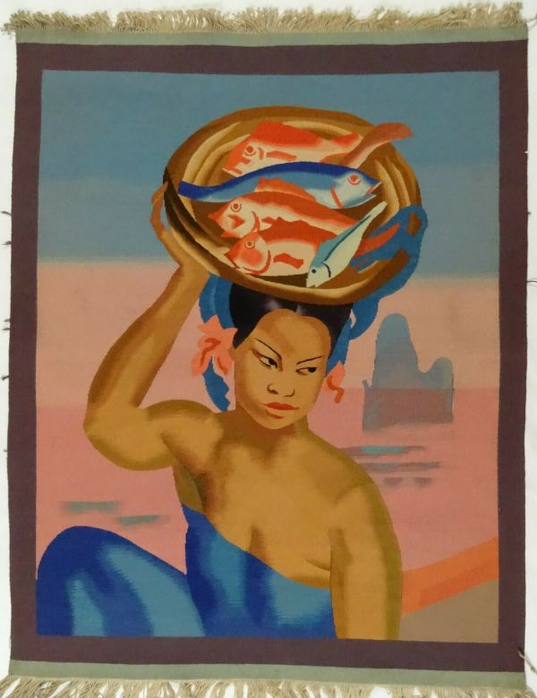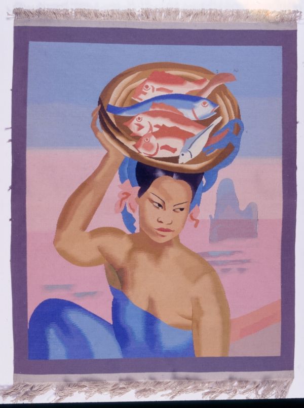 Jeune femme annamite portant sur sa tête un panier avec poissons, sur fond rose et bleu.