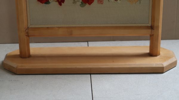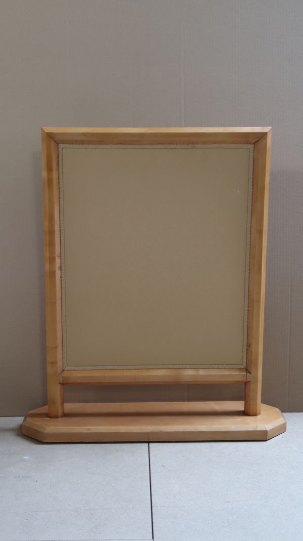 L'écran est composé d'une tablette formant socle rectangulaire à pans coupés et arêtes chanfreinées, supportant cadre rectangulaire rectiligne à montants et traverses de section octogonale.