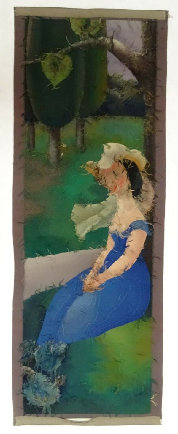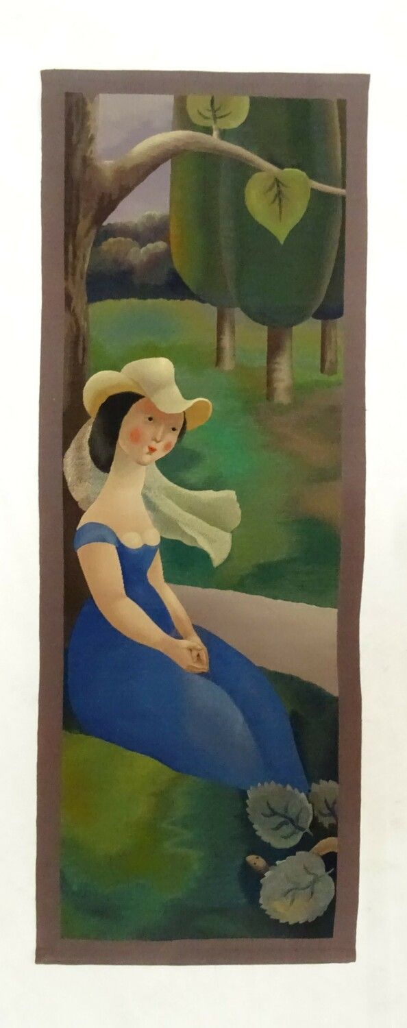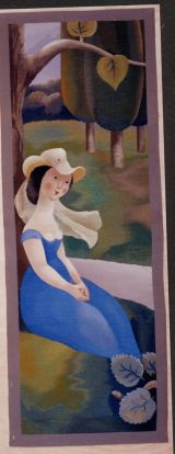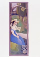 Fond général vert foncé à bordure gris mauve, une femme assise à robe bleu roi, buste et bras nus, les mains sur les genoux, chapeau à voile blanc, adossée à un gros arbre dont on ne voit qu’une faible largeur, une allée à côté du sujet formée d’une masse transversale mauve, au premier plan à la base, une tête de serpent apparaissant entre 3 feuilles. Bordure gris-violet.