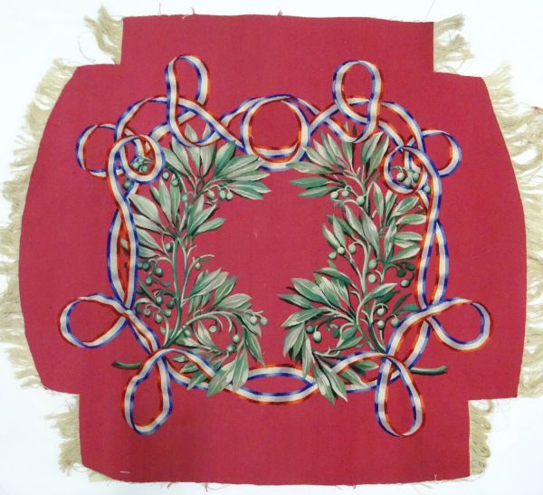 Sur fond cramoisi, un ruban bleu, blanc, rouge encadre des branches d'olivier vertes (2 tons).
