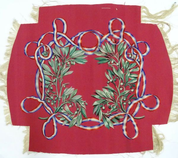 Sur fond cramoisi, un ruban bleu, blanc, rouge encadre des branches d'olivier vertes (2 tons).