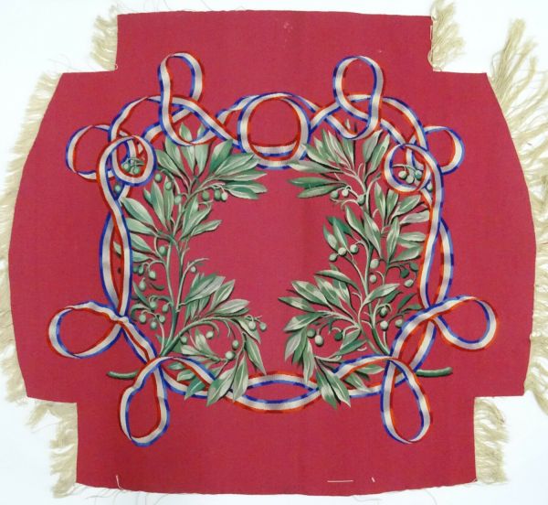 Sur fond cramoisi, un ruban bleu, blanc, rouge encadre des branches d'olivier vertes (2 tons).