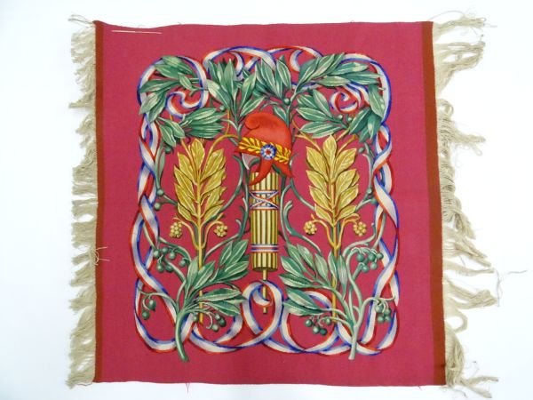 Sur fond cramoisi un ruban bleu, blanc, rouge encadre avec des branches d'olivier deux palmettes dorées et un faisceau de licteur au centre coiffé un bonnet phrygien rouge orné d'une couronne de lauriers. Bord latéraux marron.