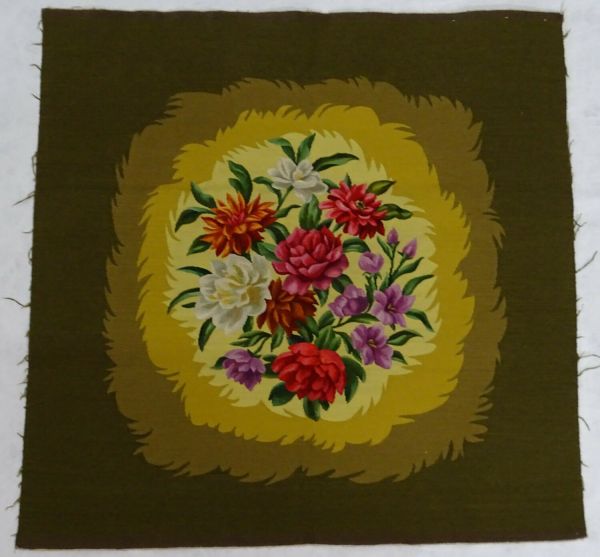 Forme trapèze, devanture convexe. Bouquet de fleurs sur fond jaune serin en forme de médaillon à bordure dentelée 3 tons, contrefond réséda.