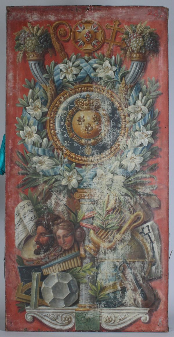 Sur un fond rouge se détache un médaillon circulaire avec fleurs de lys d'où s'échappent deux cornes d'abondance. . A la partie inférieure : attributs divers : lyre, tambour, deux têtes, orgue chapiteau. . Le tout posé sur une console.