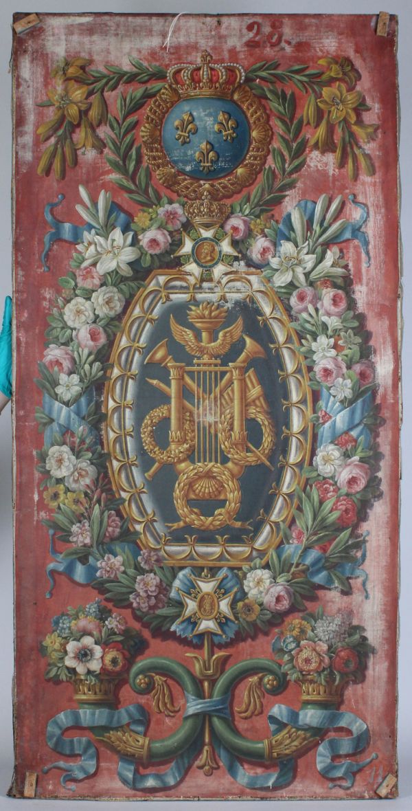 Fond rouge. Médaillon ovale à fond gris décoré d'attributs divers : lyre, trois couronnes, orgue. . A la partie inférieure: deux cornes d'abondance et croix de l'ordre de Saint Michel . A la partie supérieure : écusson à fleurs de lys sur fond bleu et croix de la Légion d'Honneur Henri IV.