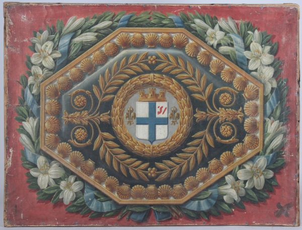 Fond général rouge. Sur un hexagone à fond gris se détachent les Armes de la Ville de Marseille dans une couronne de laurier. Entourage de feuilles de lauriers se terminant en rinceaux. Encadrement de coquilles. Pourtour extérieur à fleurs de lys sur fond cramoisi.