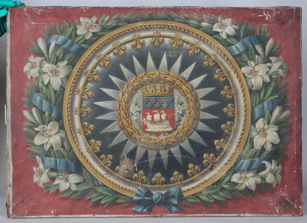 Sur un fond gris se détachent les Armes de la Ville de Paris, dans un entourage de fleurs de lys. Contrefond cramoisi décoré de fleurs de lys à rubans bleus.